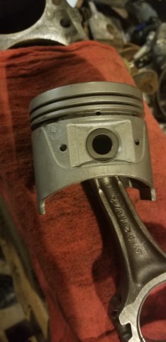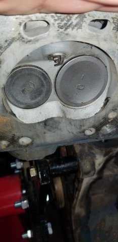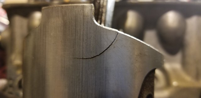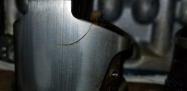 Now that the head is done, I figured it'd be good to start on the block to see if there's anything I can find wrong there that would cause the low compression in cylinder 1. I drained and dropped the pan, the oil was nasty. I could see they'd rebuilt it relatively recently, but I doubt they ever changed the oil. it was black black, and really smelled nasty. I looked at the bearings and they look almost new, no wear through the zinc coating. I still need to plastigauge it but the crank looks great. I pulled out the pistons and the oil passages are clogged and the oiler ring is caked with crud. all that is easy to clean, and I have new rings for it, but what's bad is the piston for cylinder 1 has a big ol crack in it. the crack stick out maybe 1/8 in but it doesn't look like it affected the block. I will definitely have to replace the piston. The main bearings also look new so I think someone rebuilt the block, especially since you can still see hone marks in the cylinders. It's possible that cracked piston is just sitting off enough that the rings were not seating properly. it's hard to say. I never took out the valves in the old head to see if they were burned. In anycase, I'll replace the piston and put it all back together with new seals. Phar