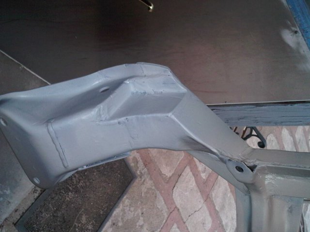 Here's a better pict of the crossmember after primering, that shows the cutout for the oil filter much better. Primered crossmember oil filter cut - VQ35HR I also pulled the engine (Again) to this time cut out a little more of the stock tranny mounts. I'm about 1/4 in too tight right where those mounts are. So I've got to remove more material, then hammer the tunnel out about 1/4 inch on each side so that the tranny will clear all the way up into the tunnel. In the VQ35DE installs, this isn't a problem, since you can't push the engine far enough back for the tranny to be tight enough to hit the original mounts because the intake hits the firewall. My shifter, even with Austin's bracket, is still 2-3" farther back from stock. I still have my stock hood latch and haven't had to mod the firewall at all yet. (will need to make a cut for the harness to fit through later.) Phar