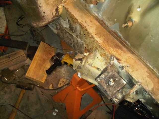 Okay, I've been doing a little more work, after I pulled the engine, I decided I needed to clear out more of the stock engine compartment so I could have more room to work out the exhaust. I removed the stock wiring harness (I'm not yet sure if I'm going to splice into it, or just use only the 350Z harnesses.) I pulled loose about everything I could in the engine compartment, and sanded down the frame rails so I'd have a surface I can weld to. I'm going to wrap the rails in 3/16ths angle steel for reenforcement. My mounts will start 12" from the firewall, making the actual mounting pins to the engine at 13.5" from the firewall. This pulls the HR engine up tight against the firewall. (I'm having to change the Brake vacuum fitting to a 90 degree angle to fit past the hood latch. Pic later) I also Modded the Tranny tunnel for a little better fit. Before After (The upper edges of the wide tail of the Tranny needs the extra room. I left the lower part to mount exhaust brackets to. Passenger side cleared out, Just the harness through the firewall remaining. Sanded for welding in re-enforcement. Before mount removal. 13.5" to mount pin, 2.75" from rail. -15 deg slant. (little surface rust, cleaned up with wire wheel.) Any questions, Let me know Phar