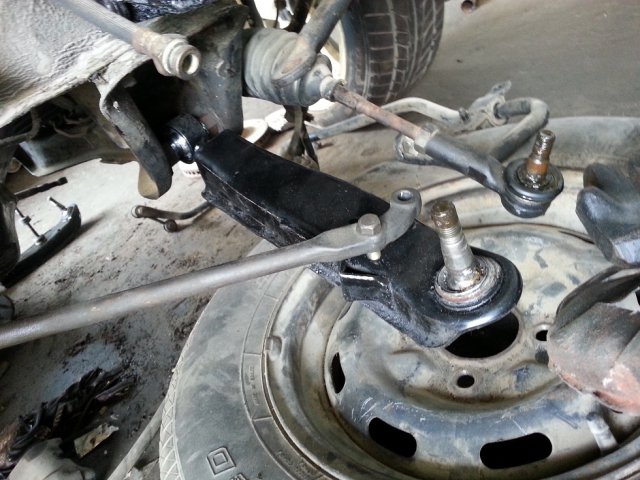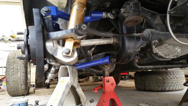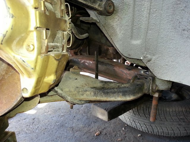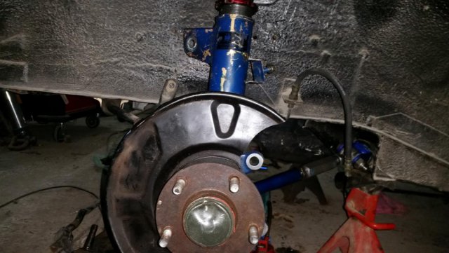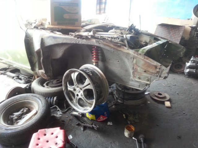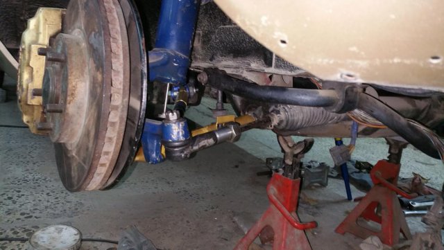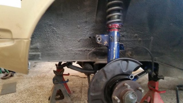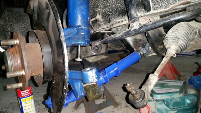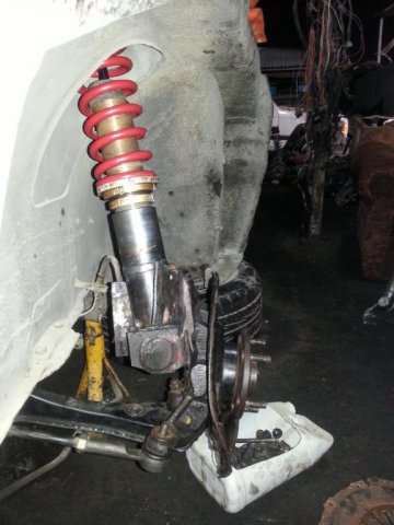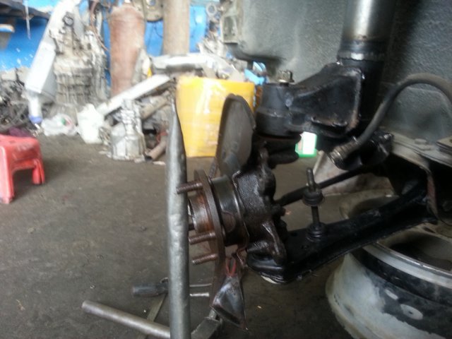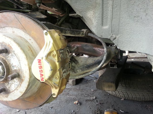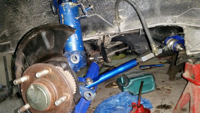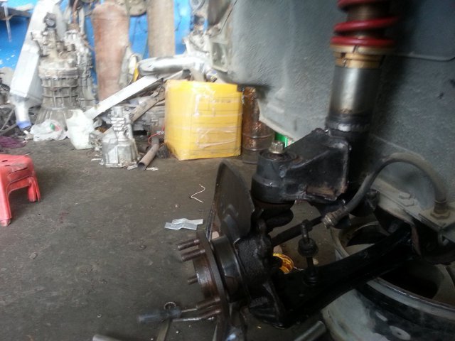 15. Went ahead and swapped the front amount with R34 front suspension, R32 Front Knuckles, Hubs, Suspension, drums, braks and gts32 lower front control arms and kept the oem front crossmember and tension rods. Made two custom threaded adapters welded with knuckles. Also removed upper oem suspension cup, trim them from edge and made custom base plate bolted on upper r34 suspension to mate oem cup. I Cut upper control arm(caster angle) of r32 because of not enough space to fit it in the body and replace it with holder lever that move up and down but ran into an issue with high speed stability and ugly looking