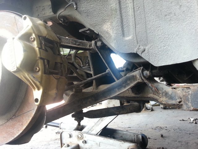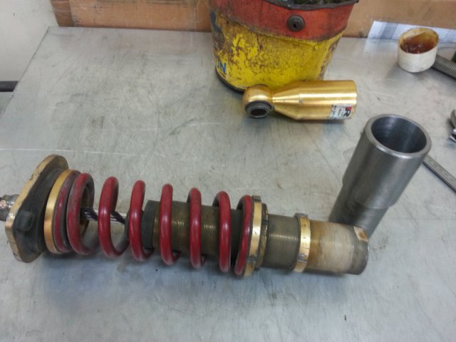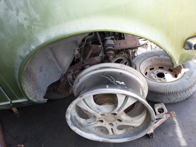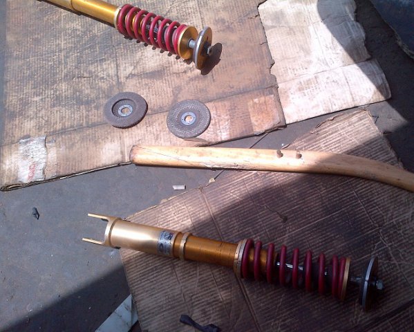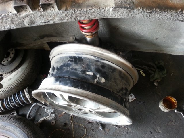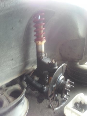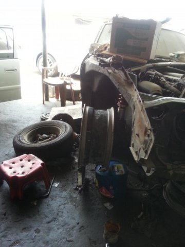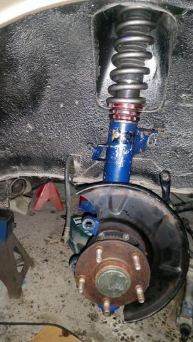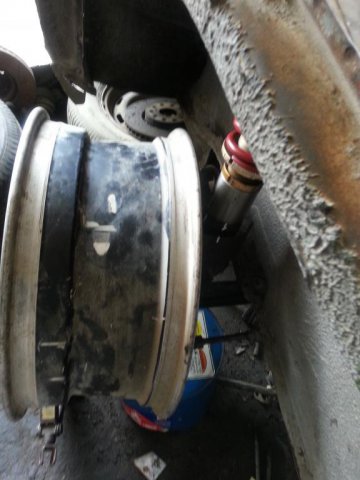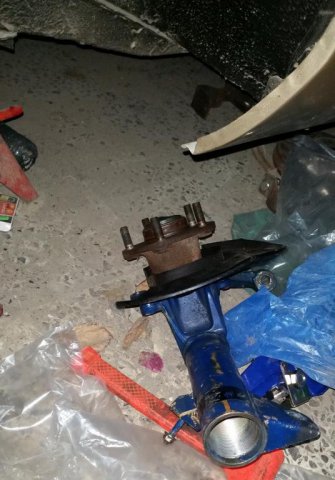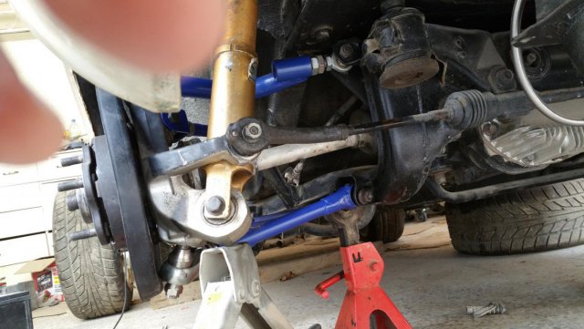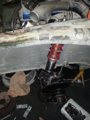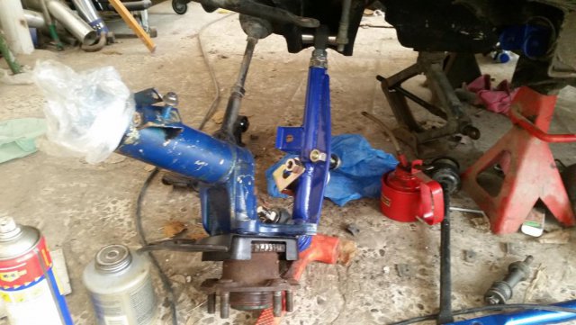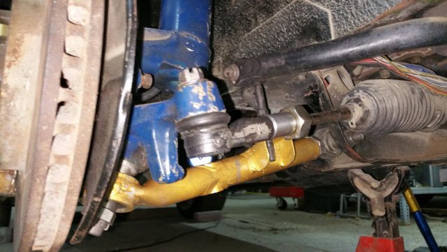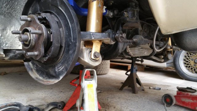15. Went ahead and swapped the front amount with R34 front suspension, R32 Front Knuckles, Hubs, Suspension, drums, braks and gts32 lower front control arms and kept the oem front crossmember and tension rods. Made two custom threaded adapters welded with knuckles. Also removed upper oem suspension cup, trim them from edge and made custom base plate bolted on upper r34 suspension to mate oem cup. I Cut upper control arm(caster angle) of r32 because of not enough space to fit it in the body and replace it with holder lever that move up and down but ran into an issue with high speed stability and ugly looking