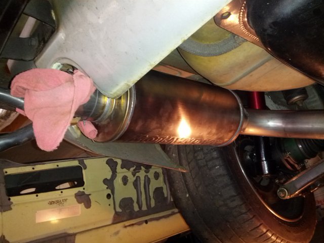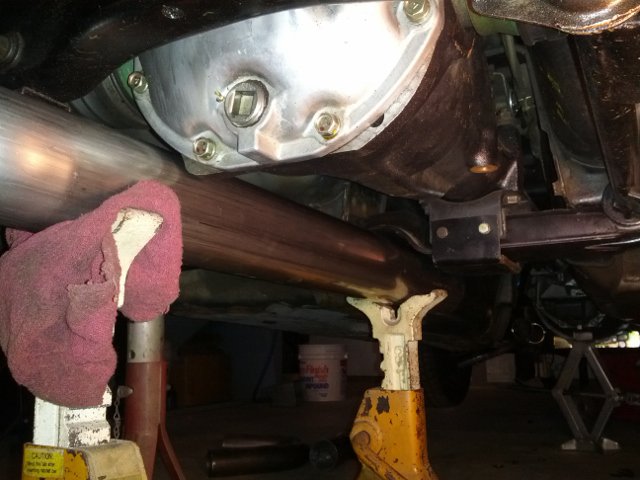 Time for an update on the 3" exhaust. I have been working on it when I have time, fitting it all together. This past weekend I finally got to start welding the stainless stuff together with my little MIG welder. It is difficult to make the welds anything but fugly. The tip isn't welded on yet... I think I like it the way it is (length of it that is), but I'm going to look at it each time I walk by for a few days before I make up my mind. This 6" round Magnaflow fits nicely: Rear hanger isn't supporting the weight of the exhaust at the moment. I purposely located the stainless wire here at the bottom of the pipe going under the diff... in the case the pipe drags on the road at any time, this will act as a "pad" to keep the pipe from getting scraped up. I'm thinking the exhaust will drop about an 1/8th once all the joints are tightened up and I remove the jack stands: Trying to keep the pipe as close to the car as possible... My ugly welds... I tried practicing on some more scrap tonight. 5" muffler located in the driveshaft tunnel: Merge collector fitted as close to the header as I could get it: Lots of pieces necessary here to fit the header to the merge collector: I hope to finish all the welding this week/week end. Now if I could just locate an LD28 water pump, I could get this thing started.