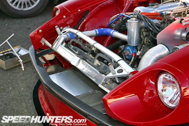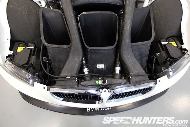 First off Id tip the radiator as far forward as it would go so I have as much room to vent out the top of the hood. Two fog light sized brake duct holes. I guess I wont go into the aero portion since were focused on cooling. Ive always thought running a short wide radiator towards the bottom of the opening would allow more space for a trans/oil/inter cooler in what is left of the opening. If you look at the pic you can see what this team has appropriated the frontal area to each cooling device. You can also see what are either brake ducts or one is for that hose feeding the carb area fresh air. I guess I would combine this radiator placement with ducting like you see on that BMW. check out this tread for a good examples and ideas of ducting. Amazing aero work being done on this car once it got serious http://www.dsmtuners.com/forums/custom-fabrication/386716-my-ducted-radiator-setup-road-racing.html