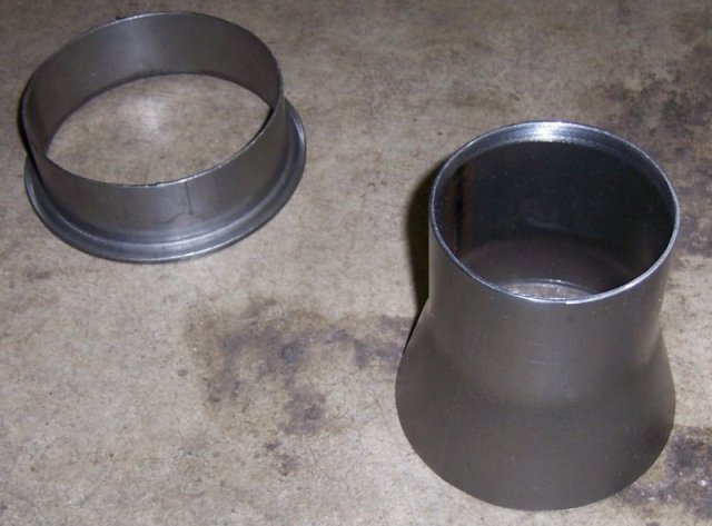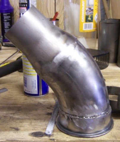 I made this downpipe, for a Holset HE351CW turbo, from a 4" v flange, 4" 45 degree pipe and a 4" to 3" transition a couple of years ago.