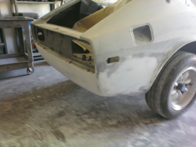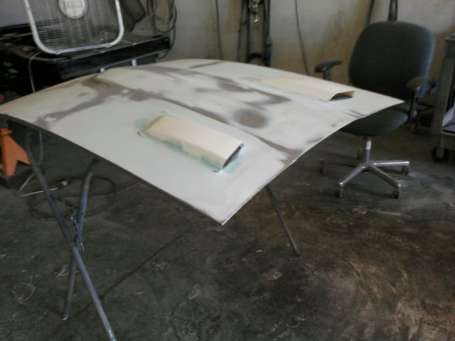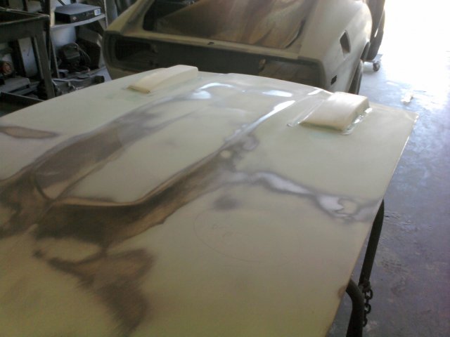 Small update. More body work has been completed, and test fit of the MSA front bumper. It is going to need a lot of work. Custom brackets will be be made to mount it, and lots of fiberglass work to get the lines right. Also, hood scoops are installed and the hood is near ready. -