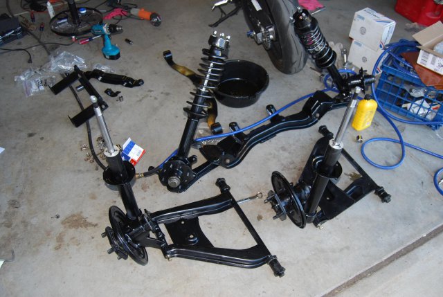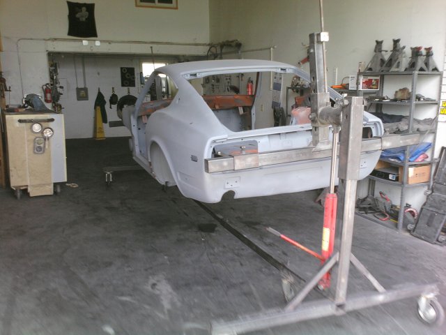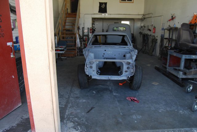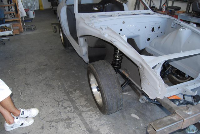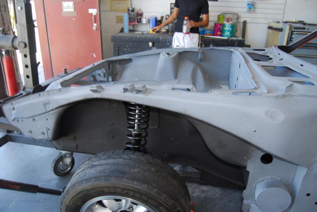 Update from the last time - I was able to get the lizard skin sound deadening and ceramic heat insulator sprayed, and just finished installing the newly painted and fully assembled suspension. I installed the rear without the differential, which worked out nicely. The car is so light that there is barely any weight on the springs, so the rear looks raised, and the front looks way out of alignment. This is just so that my paint and body guy can work on it, but it feels like a nice milestone. -