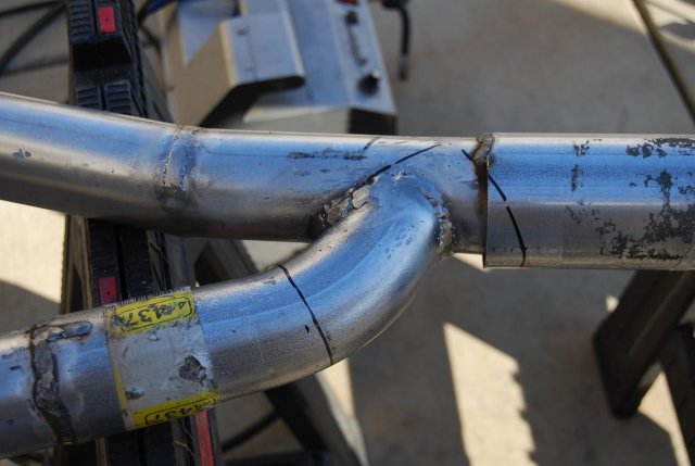 A couple more pictures. I had the Y built, and then decided I didn't like how it joined, I wanted it to be a little more gentle, and a little bigger. So, I cut out that section outlined in pen, and cut a 3" pipe to fit over the area, to create a more gradual transition. Lastly, I put it in place. Now, all I need to do is weld it to the resonators, and fab the two 90's once the muffler gets here today. It fits perfectly between the differential and the suspension, and is tucked up nicely. From the side, you can only see the two resonators in the front. -