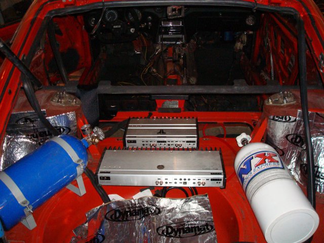 I have finally finished dynamating the car with dynamat extreme, 2 layer process. I have already started installing the 5 point harness and im also running the wires for my car audio system and the lines and hoses for my boost gauge and my nos bottles the car audio arrangement is going to be a real killer when I am finished, I have about another 6 hours of work on that to be completed.