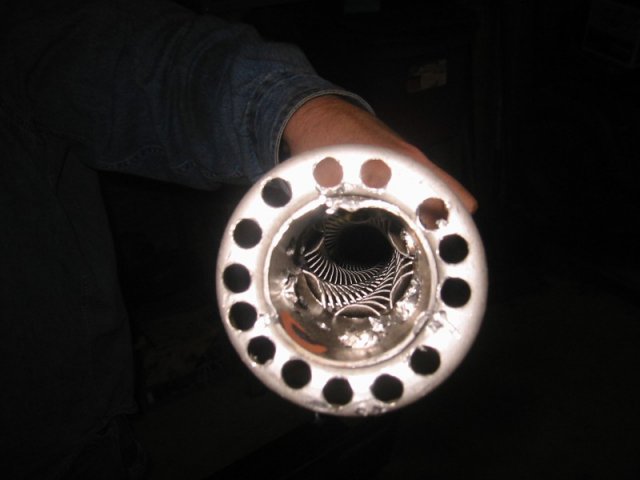 After discovering that the Patriot sidepipes had an ultra restrictive inner diameter of 1 and 5/8th inch in the muffler section, I ordered the ($100 more expensive) Dynomax kit that advertises a 2.5" inner diameter. Nope, they lied. The Dynomax muffler is just as poopy as the Patroit. However, the Dynomax muffler section easily slides out of the 3 inch exhaust pipe it is housed in. After sliding the muffler piece out, I drilled about ten 1/4 inch holes on both sides of the retaining ring and removed all the fiberglass. Not sure how loud this will be, but it's got to flow at least a little better now. Earlier tonight I heard a 350 SBC with the Patroit side pipes at a local car show. I was pretty bummed at how quiet his setup was. Hopefully my "cutsomization" of the muffler inserts will wake it up some. If all goes well, I plan to have this wrapped up by next week some time.