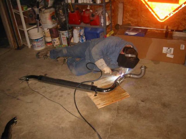 Just finished the final install and... wow, I was (am) very pleased with how these sound. I got a feeling what little fiberglass I left in the muffler isn't going to last very long. Just blipping the throttle in nuetral blasted all sorts of fiberglass material out of the tailpipe. Oh... darn!!! After tacking everything in place I had my friend "big Jer" stop by and finish the welding job. He also helped lift the pipes in place and bolted them in. Even suckered him into doing collectors. Hehe... I would have shot a short video with sound. However, the camera battery was on its last millivolt and my new rubber valve cover gasket is already leaking. Gotta love SBC valve covers. Anyway, here are a few pictures: -