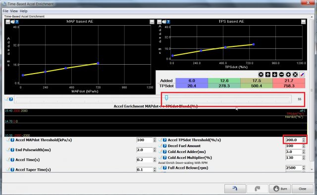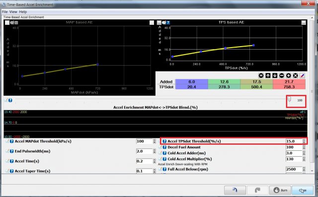 The TPS Threshold Box is the key to getting AE working correctly.. The Default figure of 200 is way too high. Try 10 to 20. Even though you can have the graph line set very low, If you don't change the Thresh hold value, all areas below the Thresh hold point ( Default = 200 ) will be ignored. First picture is of some Default settings. Second picture is what works to get rid of that " Tip In " stumble. Some engines also like a blend of MapDot... so you have to lower the default setting of 100 to about 20 as well. Default TpsDot Thresh Hold at 200. Even though graph line goes down to 20.4..all of that will be ignored till TpsDoy gets above 200. Rather silly programming od software if you ask me. Two values to change when one would do. TpsDot thresh hold configured to 15.0. Now the low end of the Graph is not ignored and Tip In stumble magically disappears. Note that Slider is all the way to the right to use TpsDot only. As mentioned. Some cars like a bit of MapDot blend as in the upper picture. But the MapDot thresh hold ( Not circled ) would have to be lowered as well. I just Luv default values that don't even come remotely close to what real world engines require Grrrrr.