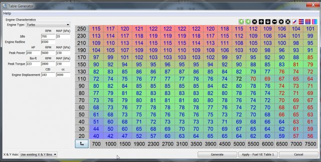 Brian. Which engine is that . The 2JZ I'm assuming by size. 3.0L Generated VE table can be crap as Steve mentioned. . Very dependant on inputted values, and even when those are correct it can be as much as 20% lean on the Top end and 20 % rich on the bottom end. It is very much an approximation... Setting Idle AFR manually is necessary om most cars, especially ones with a larger camshaft. I don't allow Auto Tune to touch the idle setting as it usually screws it up. I usually set Minimum VEAL RPM at 200 RPM above idle. Same with EGO control. This is absolutely necessary with bigger cams. The reason this Tune has minimal AE, is that I have a feeling that it is running very rich at idle and just off idle. Probably 12.5 to 12.0 or richer. Common with big injectors. It can be hard to get the Pulse Width down low enough to get a good idle AFR ( more difficult with Batch Fire ) . Which should be usually end up at 13.6 to 14.0 with Batch fire and a stock cam. 13.8 is a good starting point. Big cams like the 13.0 to 13.5 AFR at idle range. 1st step off idle to 1,500 rpm should be very close to the idle calibration. This will smooth Tip in response from a stop and at cruise. If the main Fuel Table is rich all over... you don't even need AE and the car may run surprisingly smoothly. It will be swilling fuel though and money will be flowing out the Tailpipe. Once you get an ideal AFR ratio dialed in... and that means Cruise AFR's of 15.0 to 15.5 ( or higher with CDI Ignition ), THEN you need more AE. He is also running a TON of ignition advance down very early. Turbo cars like to do this to build boost quickly and to combat low CR, but in this case I think it may be excessive. Again, I'm thinking this car is running really rich down low and that is preventing low rpm detonation. But done improperly, it can also make the Turbo lazy. Once you lean it out a bit, you can back off the amount of low end advance. If you don't, the engine will be fighting itself one you get above the 1,500 rpm range because the flame front will burn quicker when closer to Stoich. Flame propagation speed is affected ( slowed ) by excessively Rich and Lean mixtures. I'd like to see some datalogs of idle and cruise if possible.... -
