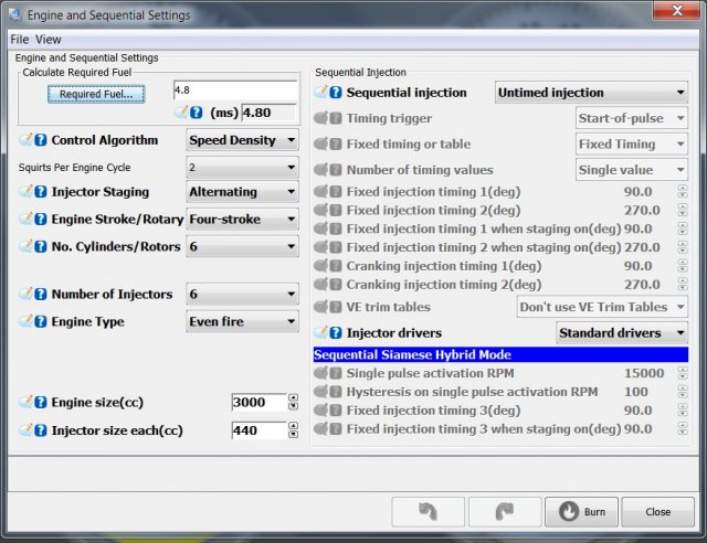 I meant reduce spark table 3 degrees overall when Boosting IE: over 100Kpa. "Under Boost " meant when ON Boost. I used a PW calculator developed for Haltech. It's very good. Numerous other online calculators and they all come up with the same answers. I enter the figures to get a Master PW and then add about 1ms to take care of the additional enrichment values. 4.8ms was a figure I had derived from a L28 Turbo with 440cc injectors. Another 200cc in your engine won't make a lot of difference in the Req-Fuel calculation . The tables I posted were for 440cc injectors. Here is the Injector Calculator I use, Note : For Sequential injection use an ambient temperature figure of 25c. For Batch Fire use 35c Injection Time Calculator V2.0.xls -