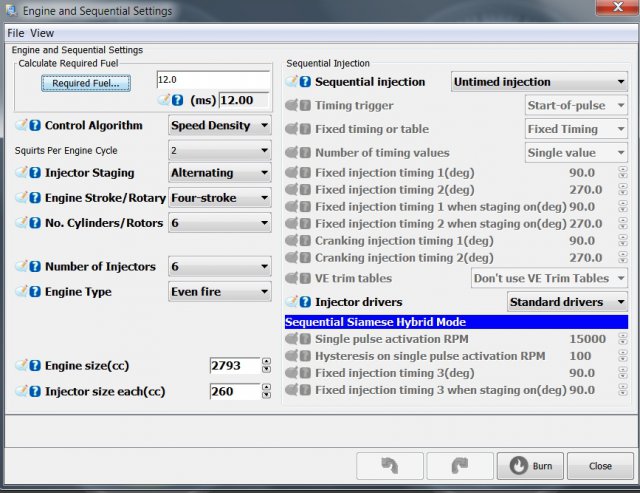 Edit: SVT40 and I were typing at the same time. Your Req-Fuel is double what it should be when your Tune is opened. . It shows as 24ms which is wrong for even a default TS setup. Set injector staging to " Alternating " and 2 squirts. Then recalculate Req_Fuel. both top and bottom figures should come out to 12.0 ms. Then recalculate your VE table using factory figures for stock HP and Torque. That will be a base starting point. If you are using the stock dropping resistors ( injectors ) you should not have PW Current Limiting enabled. ( Which it is currently ) Your Accel enrichment tables are also messed up badly. What your Req_Fuel should look like. BTW, Stock injectors are 260cc not 300. -