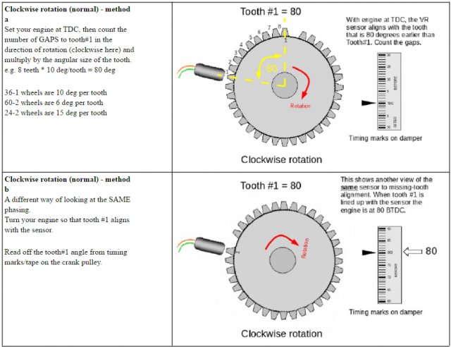 Important: You cannot Burn files to the ECU with engine running. MegaSquirt has huge warnings on this. It will corrupt the Tune's stored data. Engine has to be turned off, then ignition turned back on but engine can NOT be running. especially when changing Trigger settings. You have to switch the engine off. You will get a warning about losing Data. Click on the " **** Off " button. Turn ignition on and you will get a Comparison screen with new Data and old data. Click on the button at the lower left to apply new settings. Very poorly written software. A good work around is an Ignition kill switch that stops the engine without cutting ignition power to the MS ECU. Otherwise you have to do the funky chicken Tuner Studio off/on hokey pokey dance. If you have Burned a Table to ECU with engine running. Delete the saved tune from any Folders and start from scratch. The download folder for Firmware updates always contains a " Default Tune " . Something that MS doesn't seem to tell you... but it's there. Here is one of the warnings ( there are several;l ) about NOT burning changes to tables or settings while the engine is running. Note: There are many more tables and settings that cannot be burned ( with engine running ) than just these two. http://www.megamanual.com/ms2/configure.htm There is a Tuner Studio version for Mac OS 10.7 and up, but you cannot use the Windows version . Emulators may work... I really don't know. Crank Trigger setup and Toothed Wheel #1 is explained on page #123 of MS 3.57 hardware manual: http://www.msextra.com/doc/pdf/html/MS2V357_Hardware-3.4.pdf/MS2V357_Hardware-3.4.html