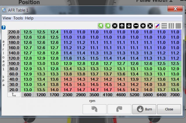 In case any one wants to take a gander, here are the AFR tables that I built. Pretty conservative, with cruise and low load cruise to be around stoic. Idle is always set a bit richer than stoic. As soon as the boost starts coming in I throw the fuel at it. 11.0 AFR is going to be nice and safe under boost. Should be fine for much higher boosts than he will be initially running. MerloZTune3.msq 2D Fuel Table: 3D Fuel Table:
