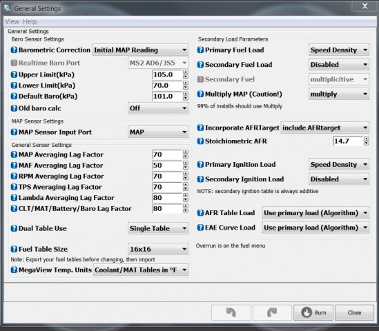 And see, I did miss post #22... cause I'm old and frequently post way too early in the morning. Yeah.. I went through all the fuel maps and ignition maps and corrected all the errors in the general settings. It's now a 2.8 liter motor with 260CC Turbo injectors. Garbage In... garbage out. A permanent fuel pressure gauge is a must have as SJ mentions. All the tuning in the world won't fix a hardware failure like a faulty FPR. Do get a Fuel gauge tee'd in there somehow, even if just for temporary use. You have to confirm the exact Fuel Pressure or all the fancy calculations goe out the window. An aftermarket FPR will be needed somewhere down the road, as I trust you will eventually be turning up the wick. Lack of CTS and having the warm-up enrichment enabled ( which was also scaled way too high ) would also make it Pig Rich. That was one of the biggest problems in your original tune. To OP: Don't tune by VE tables or change their values. You leave those alone ( once set correctly ) . You tune by altering the AFR tables. I've built you a good AFR table right off the bat. It will be safe and should run smoothly. Don't muck with it too much.... unless I built a pile of dog poo.... which I don't think I did. Same with the Spark Maps. I have idle set at 15 BTDC for a good reason ( Anti-Stall ), Car will run fine with that setting and Tune is built around it.