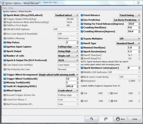 OK. This is the Tune i've built as a safe startup for Merlo's 280Z Turbo. I've done the best that I can without being there. This should be a good and safe baseline. Remember NO MORE THAN 5 lbs of BOOST!!! ( for initial tuning ) 1: Download the following .zip file and extract the .msq file to your Desktop. 2:: Start a new Project from Tuner Studio or open an existing Project A project is basically a book to load various Tunes into. 3: Load the MerloZTune2.msq file from within Tuner studio. 4: Disconnect all injector terminals or switch Fuel pump off. 5: Go to Ignition Settings menu and select Ignition Options/ Decoder Wheel. Change the " Fixed Advance " button to " Fixed Timing ". Fixed Timing is locked at 10 degrees BTDC. Attach timing light to engine and a battery charger ( or fully charged battery ) 6: Have your helper crank the engine over while you look at the timing mark. Adjust Tooth #1 Angle until you see timing light mark line up at 10 BTDC. You may need a second helper to adjust computer while you do this. When Trigger angle setting lines up with 10 BTDC on your timing light, hit the burn button at the bottom. Then Cycle ignition off and back on. 7: With ignition back on, go to Ignition Settings menu again, Ignition Options/Decoder Wheel, and change the " Fixed Advance " button to " Use Table ". Hit the Burn button. Then cycle Ignition off and back on. 8: Connect all Injector terminals or turn fuel pump back on. 9: Cross your fingers and toes and Start her up!! If everything has been done correctly it should light off and idle reasonably well.