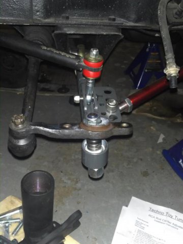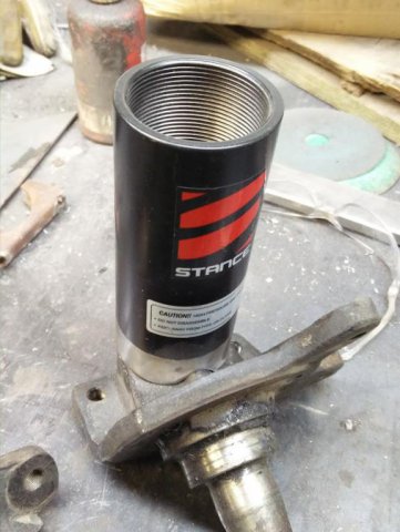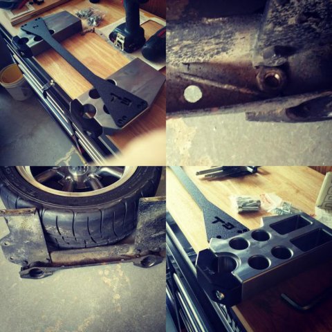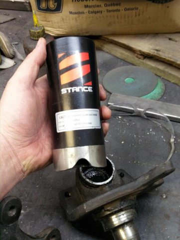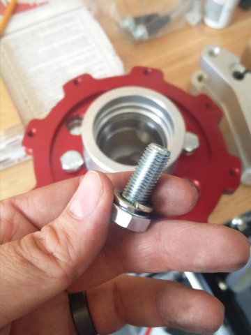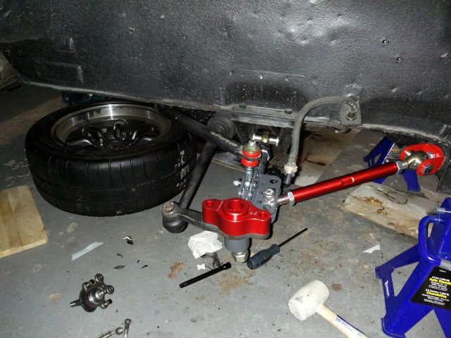So not much progress being made here. Missed ZCON. first time in CAnada, and in my back yard......missed it. Cool. Started assembling hubs and started dicking around with the front set up. Very concerned with clearance issues with the RCA and the GTx2 control arms. Had a chat with the Josh at T3. Super helpful guy. Lots of info. They have gone to a shorter shouldered nut on the bottom of the post on newest version, as well the post is now 5/8" not 3/4". Leaves me in a bit of a bind on this one though. If I cannot clear might get a shorter shouldered nut and cut the excess post. Will not know till it all goes on. Not so worried with the final wheels they are 15*9 +53- so i doubt the much of anything will be inside the barrel of the wheel. but the 15*7-0 will be a different story. I have not cut the car to put flares on yet, as I was hopping to run the 15*7 -0 till I was ready to go wide.