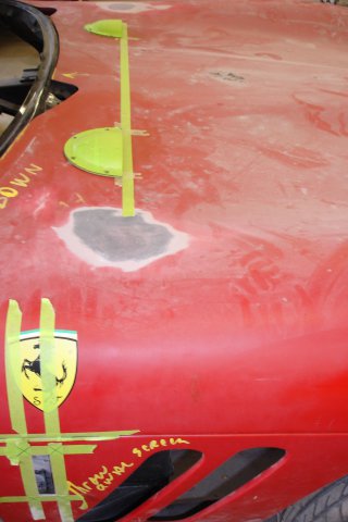 10. Mine was bad too guys. I purchased the car already complete and the bonnet alone has without a doubt received the most attention during the rebuild (My car is a cross between an old Alpha kit and a newer VR front end). It's the only part of the car that is not finished. Still need to do final fit and then paint. I've had to modify the hood bracket. The "H" design was too weak and had too much flex for my liking. I re-designed it to be an "X". Offering much more strength. The back edge along the winsheild varied in thickness and needed to be trimmed then contoured to better fit the shape of the car. The underside just in front of the wheels also required trimming to avoid contact between the tires and just match up the two sides (a cardboard template worked great). And then I filled and block sanded, again and again and again... Other modifications, but not neccesary, include "D" holes for airscoops, raised centre to accommidate a higher intake madifold (Edelbrock Pro Flo EFI), mounting brackets for the hood latches (KingAir engine cowl latches). I also cleaned up the underside with two coats of undercoating and an aluminum heat shield for the engine compartment (too prevent the heat from warping the fiber glass and damaging the paint).