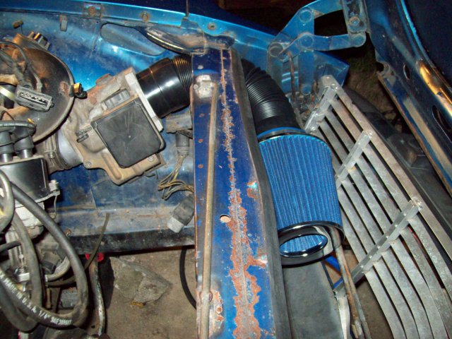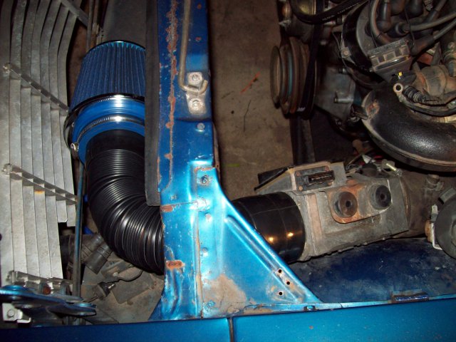 Here's my "temporary" setup. I turned the AFM upside down and ran a couple bolts through the inner fender that attach to the rubber isolators of the AFM. Ugly, but works. The filter and flex duct are from autozone and I just zip tied the filter to the hood torsion bars. Still in place after 1000 miles and probably will be till I add an intercooler