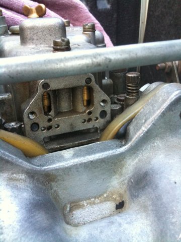 well i have a couple specific questions with pictures ( hopfully they work) 1. my stock 71 linkage is 2 1/2 inches too long to fit on the linkage for the webers, what do people do? 2. all of my webers are missing this plate on the back, the choke plate? can i run without it and will it affect driveability? beyond just starting it up and waiting? 3. where should i plug in the tube for the (vacuum advance?) from the bottem of the distributor? 4. what about a heat sheild, custom? 5. as it is now there is no fuel return, both sides are plugged. is this okay? 6. the SUs had a coolant line going through them, the webers dont. is this okay? thanks for any and all the help