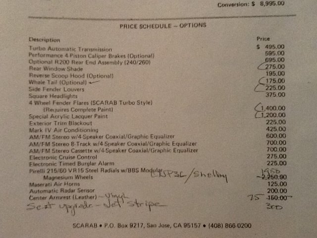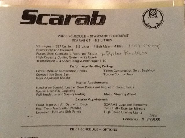 gvincent, your car is incredible looking!!! What exhaust is on there? Love the color combo you chose! Would love to see more pics of yours and the other Scarabs you have. I quickly found out that not one of the original Scarabs was built like the other. There are lots of similarities but every pic i have seen of one so far are all different. Here are a few pics of the original order form with the options on our Scarab. I've had several people tell me that this was a pretty highly optioned Scarab.
