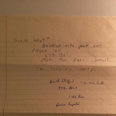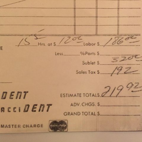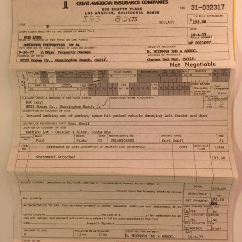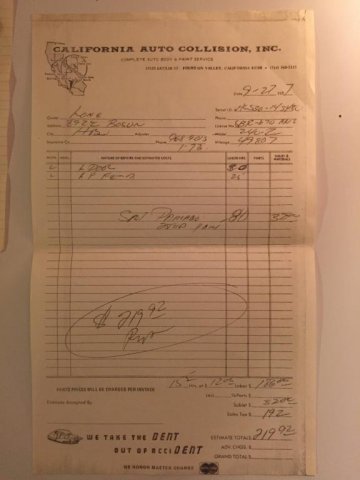 I guess I would call it more like a surface rust. There is almost no clear coat left on the car thanks to 43 years in that hot Arizona sun. I was blown away when I saw the shape of the car. Here are a few pics of the paper work I got with the car that explains the drivers side dent on the door and fender. The one pic is the women's actual hand written note she left on the Datsun when she hit it. From the insurance report, the women hit the 240 with a 1973 pinto! The accident happened 9/26/77 in Huntington Beach California. Check out those labor rates to fix the car back in 1977! 15 hours of work at $12 an hour!