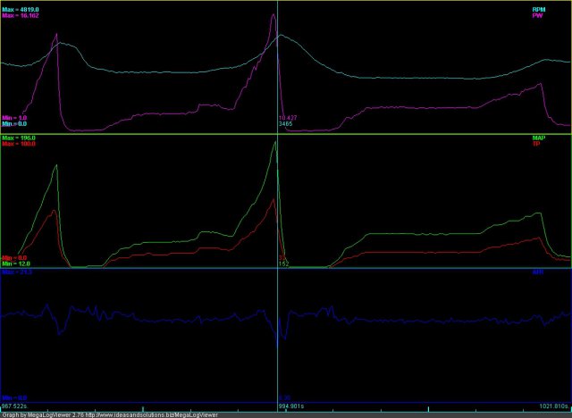 14. I have the car running really well. The timing and the mixtures are all in the safe zone and it has no burps or surges anywhere in the driving range. I have one issue and I don't quite understand it. I will try to datalog it this weekend but for now I will explain. I have the AE set as close to perfect as I can get. It's really pretty good. The problem is only when I SLOWLY roll the throttle on at a STEADY rate. Example would be going from off throttle to 1/2 throttle in about 4 or 5 seconds. A really slow throttle roll on, as in getting back on the gas while approaching and rounding an apex. When I first tip-in the pedal, the AE gives me a nice AFR but after that wears off, the mixture leans out to 14-15 during the steady roll motion of the pedal. The mixture settles back to normal when I stop the pedal movement. This happens at all RPM's and loads. A steady pedal motion, produces little or no "Kpa/sec" so the AE goes away for the duration of the pedal movement. I use 100% MAP blend on the AE and it works well. Are there any functions for steady state pedal movement enrichment? What would cause this leaning out? Could it be lag factor in the MAP reading set too low? Thanks, Dave
