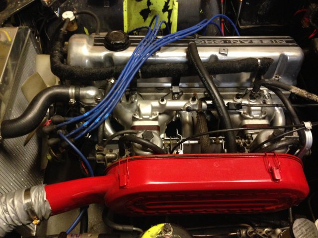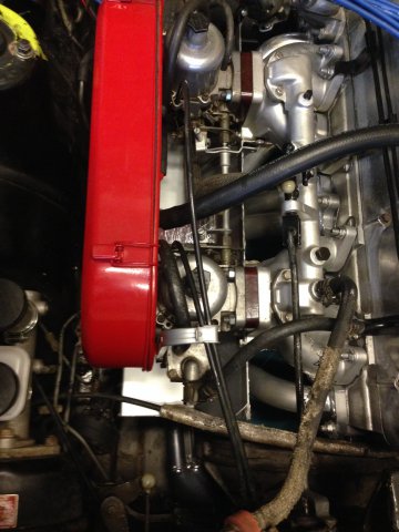 With the "new" engine in place and running there have been a few other issues that needed sorting out. On my first track day the fuel started boiling in the float bowls while running so it was time for a better heat shield between the headers and the carbs - yes these are ceramic coated headers and a better heat shield is still needed(not just a nice to have especially for track days). I built a new heat shield from scratch, it is hard to see in the pic but basically it looks like a park bench from the side without legs and covers the whole length but largely follows the style of the original with the addition of the flat bottom part. The place that is normally cut out is a bump in this version instead and the whole thing was covered with adhesive heat reflective/insulating sheet. This now keeps the carbs much cooler, so during driving there are zero issues. With this solved, I thought I was good to go but when driving on a hot day and letting the car sit for a while it starts perfectly but then it will die or become extremely sluggish. It died on the freeway which was a pretty scary experience. After looking around it looked like vapor lock so I searched around and found that insulating the fuel rail was a good way to fix this so I insulated and isolated the fuel rail. I first slit rubber fuel lines and put them over the original steel lines. I then drilled all of the mounting holes to .420 so I could put o-rings around the studs/bolts to prevent it from touching any metal. I then wrapped it with header wrap 2x. In retrospect the adhesive stuff that I used for the heat shield might have been better to not have exposed fiberglass around the lines, but either way after testing yesterday it looks like this problem is solved. It was attached with nylon washers on both sides so it is isolated from metal all around. Here it is completed and installed. After sitting for a while it is now a little harder to start, but once it starts it runs/idles great and doesn't die 1 mile down the road. I think what was happening is that the fuel would evaporate from the bowls first and then the fuel line would heat up and it would push fuel back to the bowls but leave the lines empty. So I am going to try isolating the fuel bowls from the heat even better, maybe add another layer to the heat shield or wrap the bowls. Either way it shouldn't leave me stranded in the middle of a freeway until it cools enough to drive. Yes I am still using the mechanical fuel pump and belt driven fan. -
