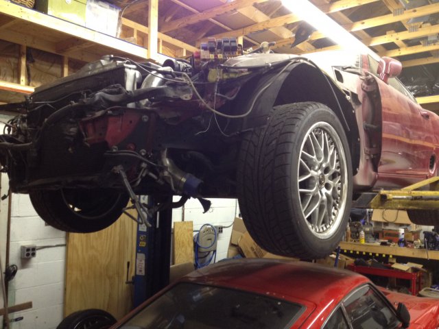 So I own a Supra but thanks to an idiot Sears driver in a work truck it got bent pretty good. I also own a 240Z with a swapped 383 SBC and T56 using a VLSD R200. I never liked the SBC much. The carb secondaries refused to open, the 3.7 gearing was awful for the motor, and the T56 (my second!) has bad synchros. The first T56 arrived having had the chip magnet go through the gears - toast. I really like forced induction, I mean REALLY like it. I also like tuning EFI. The SBC allowed none of this although I did amass the intake parts to switch it to EFI and I had an AEM 1010 ECU on the shelf. Turbo was an option with this motor but... meh. After the Supra was wrecked I was pretty depressed. 3 years of fighting with Sears and other things really sucked, I'd spent more money and hours on the Supra than you can imagine and it was immaculate. Issues with Z and having the ignition fry itself didn't help. I just couldn't bring myself to work on my cars any more. Well, I think I'm finally ready to do something. I have what's left of the Supra on my lift and it looks like many of the perceived issues with swapping in the 2JZ have been solved by members here. that I have a friend who near weekly sends me links to vids of 2JZ swapped into whacky things has certainly helped! I'll post some pics later but right now I'm researching and sourcing parts to do this. Below is my short list Stub Axles - these are coming in a 39 spline version that doesn't taper like the ZXT stubs do. The guy has them available, is responsive, and mine should be here in less than two weeks! Subframe - this will allow me to bolt in the 2JZ. Requires welding but you can't have everything I guess This has been ordered and I expect it to be here in the next couple of weeks. Brakes - currently I have Outlaw circle track brakes on 5 lug stubs in back. No parking brake sucks! Forget Willwood spots, they suck worse. This hasn't been ordered yet but it's high on my list unless someone else has a better idea. Front will remain Outlaw. Wiring - this guy does custom work and can minimize the harness down to nothing! Not ordered and not yet spoken to him but he's recommended many places. I will use an AEM ECU, likely purchasing the V2 box. Not sure what I wll do for fuel, I have an aluminum cell in it now setup for a carb. I have larger 1Kcc injectors, a custom intake, and a Q45 TB sitting that I may or may not put on the car. Intercooler is also up in the air, it will be honking huge I suspect as my datalogging on the Supra busted a few myths about intercooler sizing. I like what Z-Gad has in his I'll be doing an R230 diff from an Armada using a 300ZXTT VLSD. Tire height between the Supra and the Z is near exactly the same and the Supra had a 3.1, the Armada setup will be 2.94. I have a line on a TT rear now, not yet searched out an Armada diff. I will be using my V160 6spd, I may shorten the shifter as I don't want to cut a NOS console, I may move the motor forward to accommodate the shifter too. I will want to keep the ABS sensors and mount some up front, I have a RaceLogic box that saved my life a few times already that I WILL want in the Z for sure and it requires sensors at all 4 wheels! I have a smaller turbo for the 2JZ that I may use in place of the 71GTQ, it's 61mm. I also have a fully ported new head and bigger HKS cams. Cams alone on my previous setup were supposedly capable of getting me to 800RWHP from the 720 I was at when I ran out of airflow. I made nearly 600RWHP on pump gas with some methanol, I'd love to run two tanks but space is an issue I suspect. Car is caged already thankfully! This may take awhile but I'm moving again I think. Big thanks to Z-Gad and to Speedy for their help on the differential as this was KEY! I want the car to drive much like my Supra with a thousand lbs removed and the Armada should do it as well as be bulletproof. Z-Gad confirming that the V160 fits was also huge, so many people made it sound impossible or requiring tons of fabricating that his confirmation was a load off my mind. Only a shop in OZ could I find that had done it in a Z and they made it look really hard, somewhere I have that magazine article scanned. Nice too that Beta and others are offering parts for these cars to solve the hurdles, they will be getting my cash for sure. Fingers crossed this goes well. I will swap all the rear parts first before pulling any motors and try to take my time. Sadly time is the one thing I'm shortest of on this project but I'm looking forward to it for sure. Wish me luck!