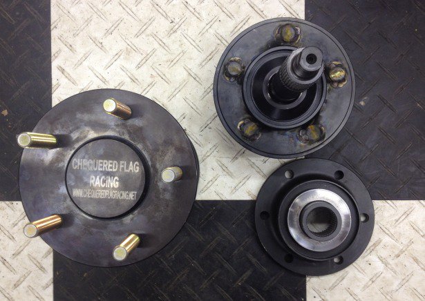Stubs arrived today! they must have banged together a little in shipping as there was a burr or two on the splines and I have some burrs on the threads at the end of the axle but nothing I cannot easily solve. A little anti-sieze and the stubs slid into the flanges without issue! Awaiting the rest of my brakes from Silvermine. I received a box that had two brackets, some brake hoses, and some clevis for the parking brake but nothing else has arrived and no additional tracking numbers so I'm a little puzzled - it's been 5 days since this box arrived via USPS.... also Chequered Flag doesn't send end caps (apparently) with their axles which I believe Ross used to. If I were to bolt axles onto these the shaft would walk and either trash the CV or the diff I believe. I am going to have to have something machined to prevent this <sigh>. It also looks as if the shift that connects the two CVs will have to be custom made and no one professes to have them. Weird that parts to adapt the CVs are available but the rest is apparently vapor Ah well, here's a nice stub awaiting brakes so that i can put them on the car! P.S. My Armada differential also showed up today! I've yet to unbox it but I will snap some pics of it side by side with my 300ZX TT differential ASAP. These will have to be shipped off to be merged and the result will be Frankendiff