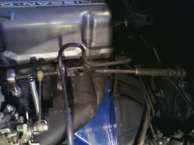 Sorry for the crappy picture, my camera isn't working right. Anyways you can see from the picture enough how the previous owner of the intake made there own linkage. It works very well and it opens the throttle all the way, He attached the adjustable links into the manifold by drilling and tapping the holes then using a bolt on the outside to tighten them down a bit. Otherwise he modified stock parts to work on the linkage, As soon as I can I will try and take a better picture of the set up.