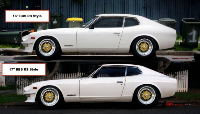 I made this little comparison between 16" or 17" BBS RS Style wheels to help decide on the size for the special s30 production group buy. I'm starting to lean towards 17" after my crappy photoshoping. Gave it a little drop also. I used Sexual Sushi's 2+2 for the comparison since he took a perfect side shot with his 16' Minilites and with his 17" rota rbr. I tried to keep it to scale as close as possible and resize directly over his wheels. What do you guys think? -