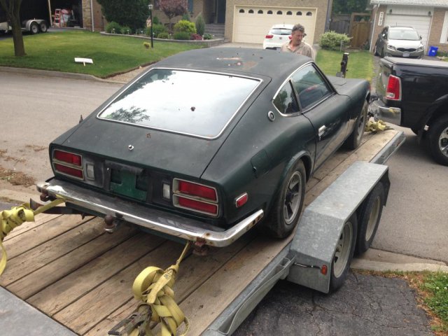 Hello all, I've been lurking on the site for awhile, and finally decided to take the plunge and pick up an S30 Z-car from a fellow forum member over at OntarioZCar, along with my brother (Adrian Z). (If you're in ON, and not on that forum, I highly recommend it - great bunch of guys). This is going to be a dedicated build thread, I will try to make it picture-heavy, as those are always the best ones. She's a 1974 260Z with 46k miles on the ODO. I thought it was mostly original, but on closer inspection in the shop it's had some work done on it (not good either, going to be a bit of a pain to fix). The front frame appears to have some damage and they fixed it poorly. The floorpans are shot, there's typical rust everywhere you'd expect from a 40 y/o car in Canada, but nothing that's not fixable with a bit of work. The bigger issue is that it was sitting neglected in a barn for the past 15 years, and the engine seems to be seized. Clutch is unresponsive as well, breaks nonexistent (work on moving first, then worry about stopping). The previous-previous owner jimmy-rigged the wiring, so that needs to be redone, and he took the stock carbs off in favour of a single-weber setup - not sure why. So far I've just been inspecting and figuring how deep of a hole I've dug for myself. I washed the car, drained the goopy old oil, and slapped a new oil filter on. Filled it with 10W-30, not sure if that's best, but some forum folks seem to think it works, so that's good enough for me. I'm pretty sure the rings are rusted to the bores, so I pulled the plugs and filled each cylinder up with WD40, leaving it overnight to try penetrate the rust, see if it feels like turning tomorrow... Taking her home Weird single-weber setup Interior - Driver's seat shot, the rest is ok Badly repaired front frame under the engine (not going to pass safety here...) Rotted floor pan First of many oil changes Eric