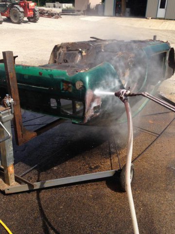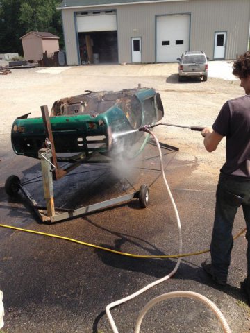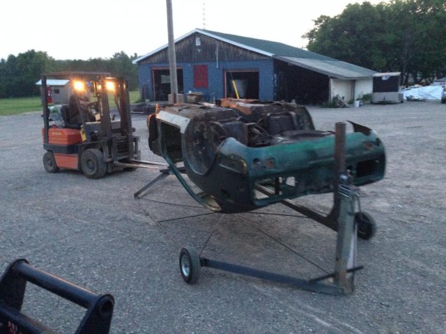 Thanks tamarac attack, I'll definitely be doing that. The 260 is up on the rotisserie finally. We ended up making one with some jacks I found lying around on either end for vertical adjustment. The car is supported by the strut towers instead of bumper brackets like usual, should give more stability while I'm cutting out the frame. It's got wheels on one end, and a hitch for the forklift on the other - works like a charm for moving the car between shops for working and storage. I'll be sandblasting her this coming weekend hopefully, and finally see exactly what kind of rust issues I've got to deal with - pretty excited. Eric