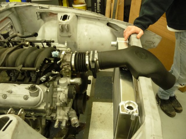 Sorry for my mental lethargy. I forgot about our previous interactions on this topic. I suppose the answer to your question is, it depends. I suspect you can make the radiator short enough and tilt the radiator but will it retain the necessary cooling attributes ? What I can do is take my shortened radiator and see how it would have to be positioned to allow a C5/C6 Corvette intake to pass. I believe, without evidence, that your best bet will be tilting the radiator forward as the TB is about even with the core support. Tilting the radiator back will cause more interference than less. The attached picture may help support my point.