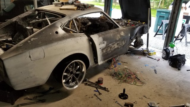 '77 280z aka Project Tetanus (LS6 383, T56)SH4DY replied to SH4DY's topic in S30 Series - 240z, 260z, 280z Lot's of changes and developments over the past few months. Lot's of Skillard stuff, Redid the headers/ exhaust (single side exit now), went to the dyno.. All kinds of stuff. Oil Catch can I made to fit in the factory washer reservoir spot: WHP axles (left) vs ZXT remans Skillard front splitter (2") and the side market deletes off eBay (I think a member on here?) Interior shot with the dash I made using the factory substructure: I changed up the headers/ exhaust quite a bit - now they are 1.75"->1.875" with multiple merges. I went this way because the old exhaust was rubbing on everything even tucking it up as high as possible. To get it to fit under the car I would have needed to oval the entire thing which I didn't want to get into. Luckily with all the merges, it's actually pretty quiet even without any real muffler. What it looks like all together. It's completely heat wrapped now. And finally: I finally made it to the dyno. It was kind of bittersweet. Who am I kidding - it was a kick in the dick. My Speedhut wideband started reading erratically and the MS3Pro followed suit making changes to the fuel map that made the car undrivable and caused a backfire through the intake trumpets that melted one of the screens on the ITB's. So that was fun. I disabled the wideband corrections, cleaned up the fuel map and changes the spark plugs all while still on the dyno and it was a brand new car. I just used the dynos wideband the rest of the time as the Speedhut unit continued to be flaky and erratic. At the end of the day I called it quits at 390rwhp SAE uncorrected - the fuel was pretty spot on and timing changes weren't making any difference in power. Yes, for the parts that are in this thing I had expected much, much more - I was thinking 500-520rwhp. So I was pretty defeated until the next car that went on only made 276rwhp and it was an LS1 with Intake, headers, full exhaust and tuned. Soooo, to be +40% over that... that's actually probably about right for a 383 LS with ported heads and a cam. You just get so used to internet heroes with bolt on LS's making over 400rwhp, you forget not all dynos are the same. I'll post the graph later on - peak power is around 5,600 and it's pretty much nosed over by 6,800. With the cam thats in it I was thinking it would carry the power higher but the 52mm ITB's might be restricting it up top on this size motor. Overall, I'm happy with it. It sings a sweet song.