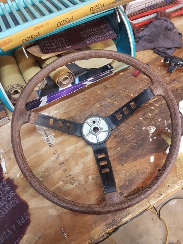 Did some more body panel work. I stripped all of the panels using aircraft stripper and then had a friend clean them up using his sandblaster. Despite reading in several places that YOU SHOULD NEVER SANDBLAST BODY PANELS! I did anyway and boy should I have listened. The panels aren't ruined but the hatch was warped about a 1/4" on the bottom section and oil canned on both sides. I used a stud welder and hammer and dolly to shrink the panels back close to factory (within about an 1/8 inch). It was tricky to repair because when sandblasting the metal one side gets stretched (tension) and the other side is in compression. This is why the metal will raise up towards you on the side you're blasting. The hatch is about 1/4" warped After much shrinking After some epoxy primer, a lot of Rage Extreme plastic filler, and sanding. Also started work on the lower valance center piece smoothing it out. Welded some rust holes and prepped the fenders for epoxy too. Started work on the hood. Repairing some dents in the front edge. I didn't get keep back perfect, but they're probably within a 1/4". I'm just going to accept that this car is going to have some plastic filler. Oh well. At this point at least I'm using quality plastic filler (Rage). When running a straight edge across it the hood also seems to have some low spots, maybe due to sandblasting, maybe not. I've used the stud welder to shrink a little on them, but unfortunately they'll require some plastic filler. Got a couple ounces of Safari Gold in PPG DBC and sprayed it on the tool compartment covers. I obviously need some more practice spraying paint before attempting the entire car! Nasty orange peel/dry spray texture. I like the color though -- I think I'm going to stick with it. I also started disassembling the steering column. It took a while to figure out how this thing came apart, but I finally got it. I'm just going to clean it up, re-grease the shaft and bearings, paint it, and re-assemble. I'm also planning to refinish the steering wheel. Cleaned it with dish detergent and a scotch brite pad. It should look nice after some wood stain and new black paint.- 76 replies
