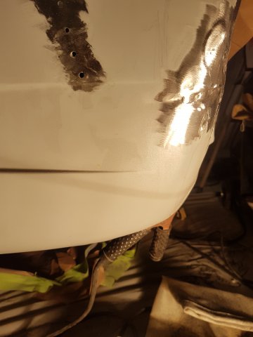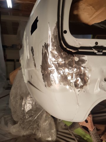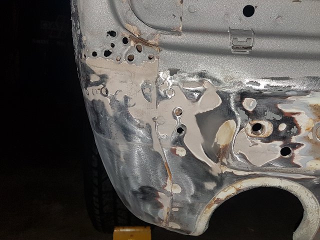 Thanks guys for the responses. I think I probably will go back in and weld the seam if nothing else just for peace of mind that it won't crack. The main reason I decided to fill the seam in the first place is because of the body damage I found hiding there after I stripped the paint. Someone had pulled out a big dent and filled the many holes with bondo. I welded up the holes the best I could but the panel was still pretty mangled and uneven, so I smoothed it over with the Evercoat Short Strand and then the Evercoat Xtreme. The issue with trying to hammer and dolly this section is the large structural supports behind the panel keep you from getting a hammer OR dolly back there. I wasn't sure how to fix it. Any advice or comments on the original situation? The hiding damage. These holes were all filled with bondo and the metal was very uneven: I welded the holes, but the metal was still uneven. I filled over the welds with Evercoat Short Strand. The backside was mostly inaccessible. More holes on the side of the quarter panel. I ended up welding these and filling over that with Evercoat Short Strand, too.
