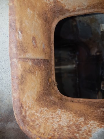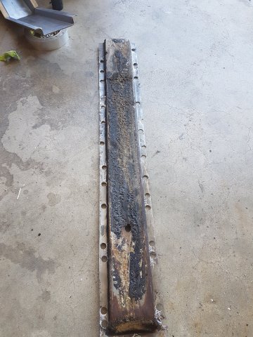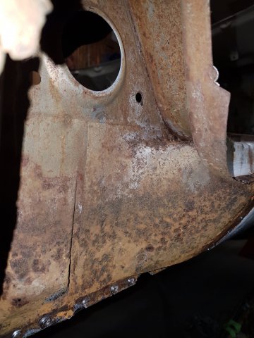 13. Removed a dog leg this evening. It doesn't look good. Pretty nasty in there. Most of the rust is down low, though, and around the fender lip. Decisions Decisions. I'm not sure if I want to just blast what I can and only replace the dog leg or replace dog legs, rocker, and the fender (inner and outer?) The more I work on this thing the more shit I find!!! Ahhhh!