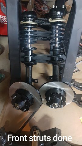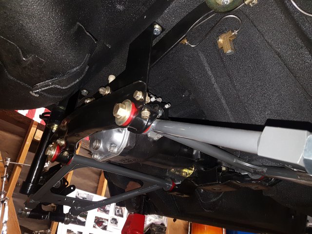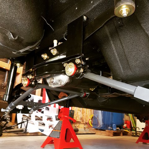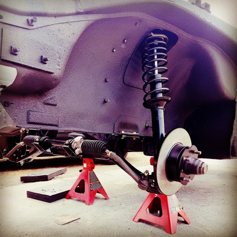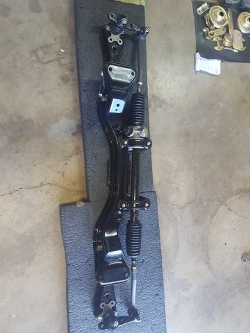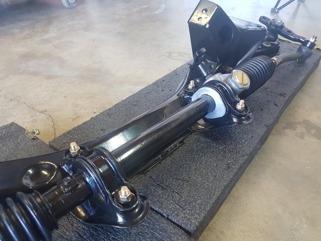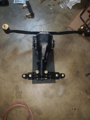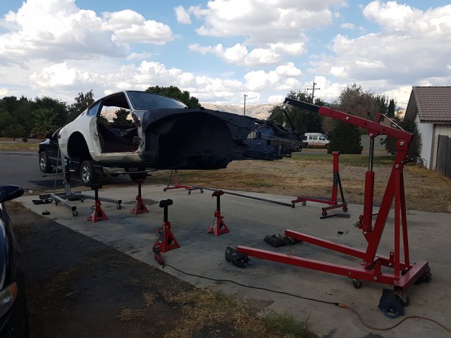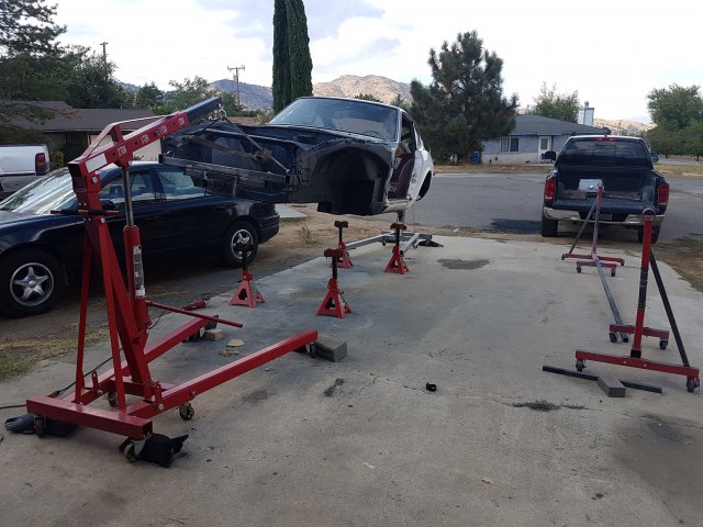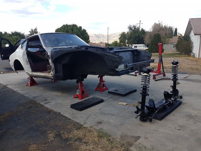 6. At this point I was in a big rush to get this thing on wheels and move it to my new house, the new house that I didn't even have yet, so finding a new place was on the agenda as well. I first assembled the front cross member and LCAs with new bushings and new cadmium plated parts. I did pressed in new wheel bearings for the front and rear. I installed new Eibach springs and Tokico Illuminas. Some rear suspension work. I cut my own gaskets for the rear differential since I was in such a hurry and had the material on hand. Cleaned up...kind of: DIY gaskets Cleaned up cover Painted and assembled. I ended up stripping one of the side flange center bolts and had to get a replacement. Thankfully only the bolt was stripped and not the female threads. I could heard some rubbing/grinding noise when I would turn the diff. Ended up I had the metal gasket installed upside down. Whoops Ready to remove the car from the rotisserie! This was a fun job to do solo. On jacks! Getting ready to install front suspension: I ordered new T3 rear LCAs and installed them. I got the front and rear on wheels, loaded it on a trailer and moved it to my new house!