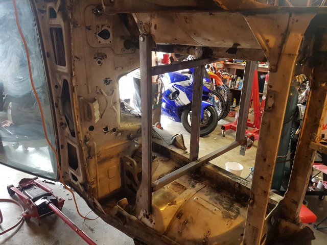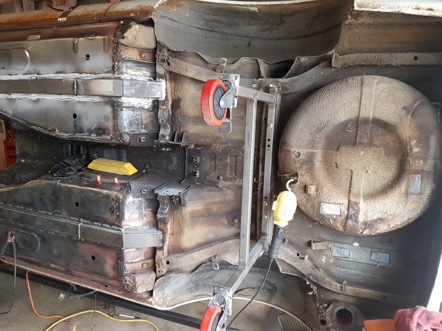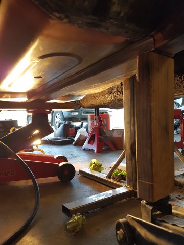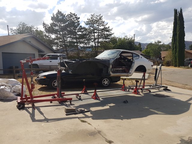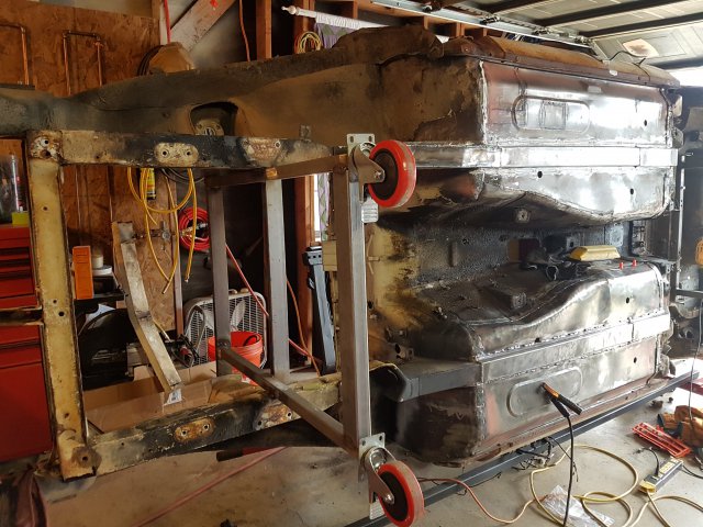 10. Hey guys, I haven't posted in a while but I've been working a lot on this project. I've made significant progress since my last post, so I'll try to catch up on the updates here. I fabricated and welded in new frame rails and bad dog subframe connectors. First I cut out the old frame rails. I went ahead and replaced the driver side floor pan since I had it on hand and it was going to be easy compared to the passenger side I did. I also welded in seat mounts for driver and passenger. I set the seats in and positioned the mounts and tacked them in, removed the seats, then did stitch welds. Sorry for the crappy picture of this. I need to take some better ones of the floors. Back to frame rails. I POR 15 coat what is covered by the new rail. Some rigging with jacks and I press the new rail firmly to the new floor pan in preparation for welding. Welded in the subframe connectors, too. At about this point I had to pack up my stuff because I was moving locations. It was interesting moving a 240z without suspension. Once I got to my new place I soon built a rotisserie and mounted the car in preparation for sand blasting the bottom, epoxy priming the bottom, and undercoating the bottom. Since these pictures were taken I connected the two stands along the bottom with a steel beam. Did some premature seam sealing before I had a clear plan, but here's a view of the bottom on the rotisserie. The red casters/frames were for rolling the car around the shop before I decided to put it on a rotisserie.