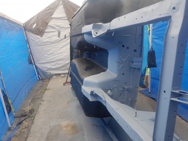 8. I welded in a almost rust free battery box I got from a previously mentioned guy from here at HybridZ. Thanks again! Mine was bad. The new. For the sake of before/after effect I'm skipping ahead in time on the next battery box pics. Here it is finished and primed. Bought a big tent from Harbor freight and turned it into a sandblasting booth and rolled straight out of the garage into the tent and got the bottom and engine bay sand blasted. But before I used it as a sandblasting booth I used it to hang and paint suspension parts. I also welded in sway bar reenforcements. After sand blasting I did seam sealer and shot the bottom with PPG DPLV epoxy primer and a truck bed liner. I shot the first underside coats of epoxy really heavy because of bad gun settings and just generally not knowing what the hell I was doing, so I had to do a lot of sanding. Not fun sanding epoxy primer. My tent met it's end when a wind storm came through. Perfect timing, because I needed to move, again.