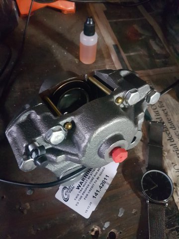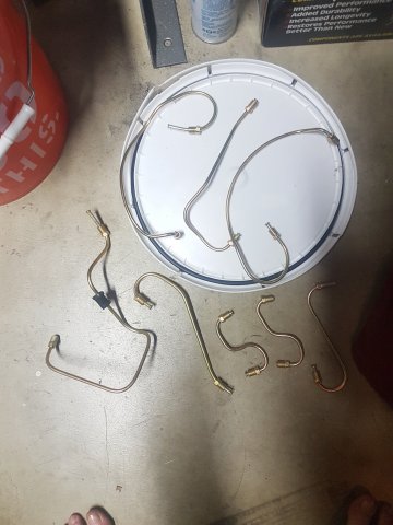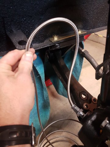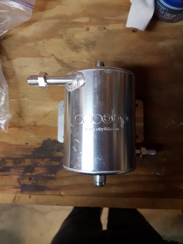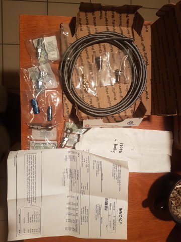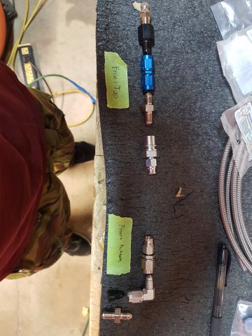 5. Got it to the new place and started doing some brake work. I decided to do a rear disc conversion using a Maxima kit I bought. Sent in my core front calipers to MSA and got new fronts. I painted the calipers in Cyber Grey. I decided I was going to make my own steel braided brake lines so I bought some PTFE Speed Seal line and fittings from https://www.anplumbing.com/ They have a lot of nice stuff. Just be sure you understand the differences between the fittings. The fittings on the car are M10x1 inverted flare. I think I've decided to run the front steel braided lines with a right angle coming out of the front calipers. Something like this: But using a right angle fitting shown below. I also ordered a -3 to -8 pressure test kit from JEGS to pressure test the hoses I make. P/N 100286 http://www.jegs.com/i/JEGS-Performance-Products/555/100286/10002/-1 Some of those fittings are shown below too. I also bought a stainless steel fuel and brake hard line kit from http://www.classictube.com/ and https://zcardepot.com/ I ordered two fuel feed lines. I'll use one for feed and one for return since the stock return is only 4mm (~3/16") and I'm doing an EFI conversion. The new feed lines should be about 8mm (~5/16"). Since I'm doing a rear disc conversion and want to avoid a brake pressure bias from front to rear, I gutted the original brake proportioning valve so it acts as a passthrough now. I'll run an adjustable brake proportioning valve either in the engine bay or somewhere else. Speaking of the fuel system earlier, I bought this nice bulkhead mount swirl pot/surge tank from a company in the UK. I have a plan to run this swirl pot, a Walbro GSL392 feed pump, a Carter P4070 low pressure lift pump, and the stock 240z gas tank. More on the fuel system later.