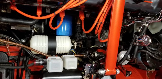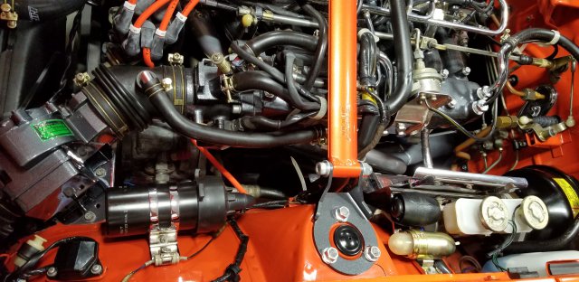 Advanced work on engine bay details: blanched the vacuum bottle, powder coated satin black a bunch of brackets and holders that were looking gnarly, refinished the HVAC dryer bottle with gloss black paint, changed most of my hose clamps to freshly zinc plated ones, painted some scratched areas on the engine bay walls and added some plastic and rubber preserver to all the harnesses and hoses. -