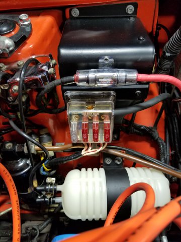 I had an electrical mishap after "finishing" my engine bay. I inadvertently pinched a cable (in front and below the windshield cowl) while tightening one of the brackets that I powder coated on the firewall. I caused a short circuit which toasted a dozen or so wires in the harness. It took me a couple of months to figure out the cause of the damage and then replace all the scorched cables with ones form a donor harness I was lucky enough to find on Ebay. Definitely not a fun job. The thing is that although the fusible links heated up and melted the insulation during the short circuit, they never broke! Electricity continued to flow and burn stuff until I was able to yank the positive terminal from the battery. It was about 30 seconds of pure panic and smoke. Thankfully no fire! After repairing the wire loom and testing everything I decided to get rid of the fusible links and replace them with a modern fuse block and Maxi fuses (as discussed in other posts). Hopefully this setup will grant me better protection in the future. Here's a pic. PS: The fuse holder above the fuse block is for my stereo equipment. -