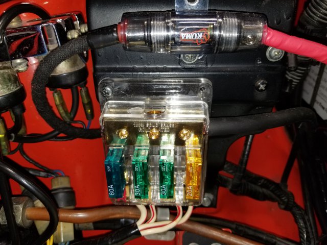 Following the logic that I'm best protected with the lowest amp rating fuse that will allow the circuit to work under max load, I did a little experimentation. I started with the recommended 80 amp fuse in the 1 position which worked fine. I then tried a 60 amp fuse which is still holding steady. In the other 3 positions I had started with 50 amp fuses (as I'm sure you remember) and went down to 30 amp fuses which have held steady also. I was hoping to go down to 25 amp fuses and give those a try but I haven't found any at the parts stores around me. I did however come upon a single 20 amp fuse I so I placed it in the 4 position (that powers my interior lights which are all LEDs) and that has held as well. If I come upon 25 amp Maxifuses I will give those a try in positions 2 and 3 and see how that goes but here's a pic of the current setup which seems to be working well. -