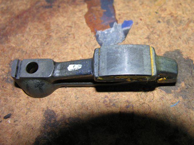 Hey, all you conspericy theoricists screaming about ZDDP, listen up! I go t a call today from Mike at Crane Cams. First question out of his mouth: "What Oil are you using?" Wait it gets better: " Do you add ZDDP?" That almost clinched it right there. So the answer to his first question is Castrol GTX 10W-30. Second was obviously no. I then went to the Castrol Web sight and searched on "Zinc". The question and answer guy link appeard with questions about ZDDP. The short answer is (and yes you have heard this before) ZDDP was phased out of motor oil domesticly in the 1990's becasue of ordinaces passed by the EPA. His position was the EPA left a hole between new oil requirments and old engines. He closed with Castrol is working on a solution. So I got conspericy theoricists on this forum (a term of endearment I assure you), a mjor cam manufacturer asking if I used it, and a mojor motor oil manufacturer admitting there is a problem. I think that settles it. ZDDP not being in motor oil is causing problems in our engines. "But wait" you say. "You kept asking why only one lobe/rocker went bad, Paul" (I heard you say it). "How does that fit in with this ZDDP thing?" Well take a look at this! When I got home tonight I took a close look at all the rockers and yep, they all look the same. This is the pad on rocker 2E. Notice the black spots in the wear area. When I first saw those I assumed the pad was somewhat pouros (we realy need spell check) and the wear had exposed the voids. But close inspection shows these are actualy pits. Notice there are no holes in the non wear area. So pitting ussualy comes from excessive spot loading on a micro level that pushes the material past ultimate (not just yield) strength and when the force is reduced the "torn" piece pops out leaving and odd shapped pit. With inadaqute lubrication, i.e. no ZDDP, the loading not only becomes compression (straight down on the pad) but shear (sideways across the face) and the two forces combine to be greater than the material strength. Every single rocker has the same spots as this picture. So I believe that all was not well and I lost one. I believe all was bad and No 2I went first. It's late for me but I had to share. I am expecting another call from Mike tomorrow. I will update with more of what he said today and what he adds tomorrow. Short answer-out of warenty, no replacment. Paul