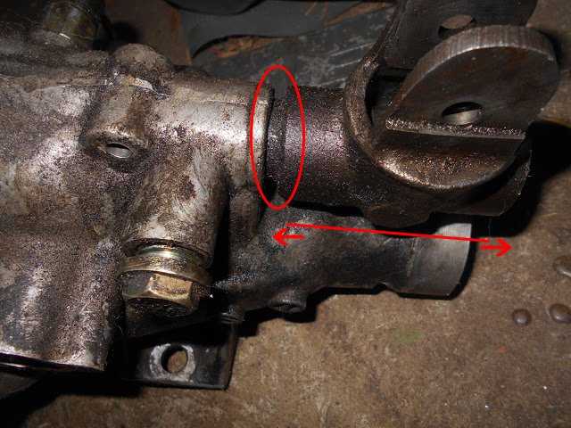 Now, on your transmission does your shifter slide in and out, like on the video in the first link I posted? Or does yours stay in place? Mine is coming out like a piston and I've wondered if it is indeed a pin missing that is supposed to stop that from backing out like it is, which would make sense why I can't even touch the 2nd, 4th, and reverse gears. I can;t even grind the gears, it's not engaging at all when I am able to shift into the area they're supposed to be. This piece, I've attached the picture showing the place where it slides in and out inside the circle, the arrows demonstrate it's movement.